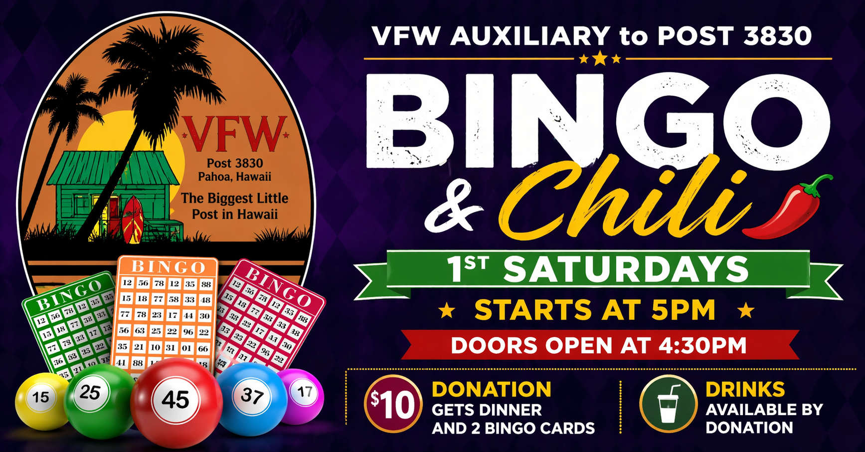 Chili and Bingo for a donation of $10.00, includes dinner of chili, rice, cornbread, coleslaw and a variety of desserts! You receive 2 cards complementary with dinner! All Welcome. Hope you can join us.